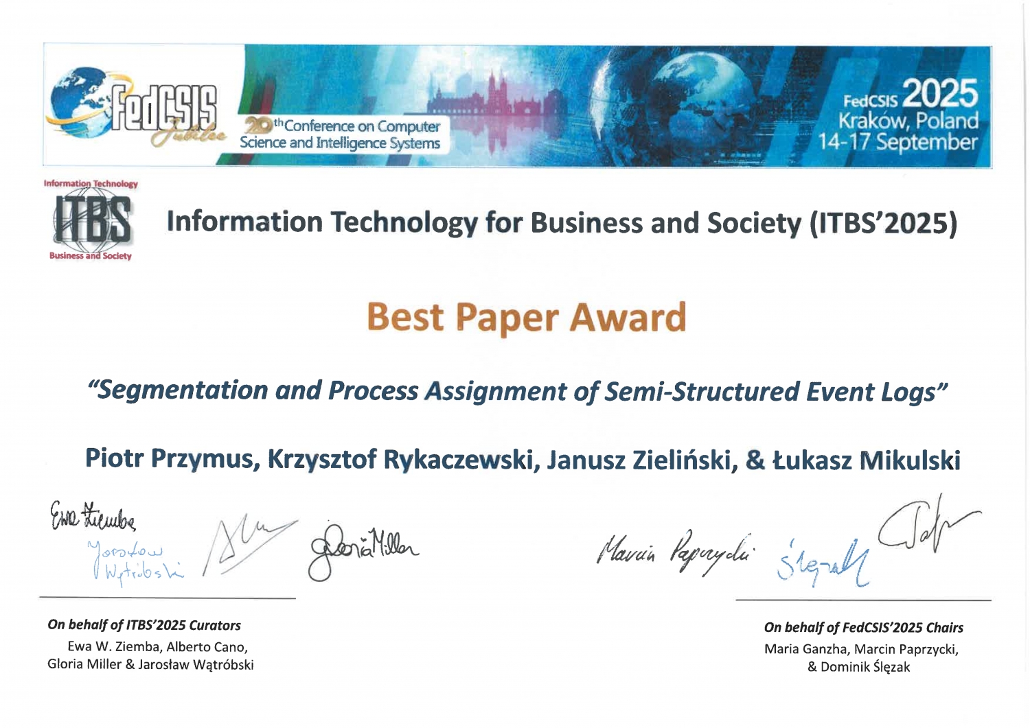 Na konferencji FedCSIS 2025 (The 20th Conference on Computer Science and Intelligent System) która odbyła się w dniach 14-17 września w Krakowie zespół w składzie dr Piotr Przymus, dr Krzysztof Rykaczewski, dr hab. Janusz Zieliński, prof. UMK oraz dr hab. Łukasz Mikulski, prof. UMK otrzymał nagrodę za najlepszy artykuł naukowy (Best Paper Award) zgłoszony do panelu Information Technology for Business and Society.