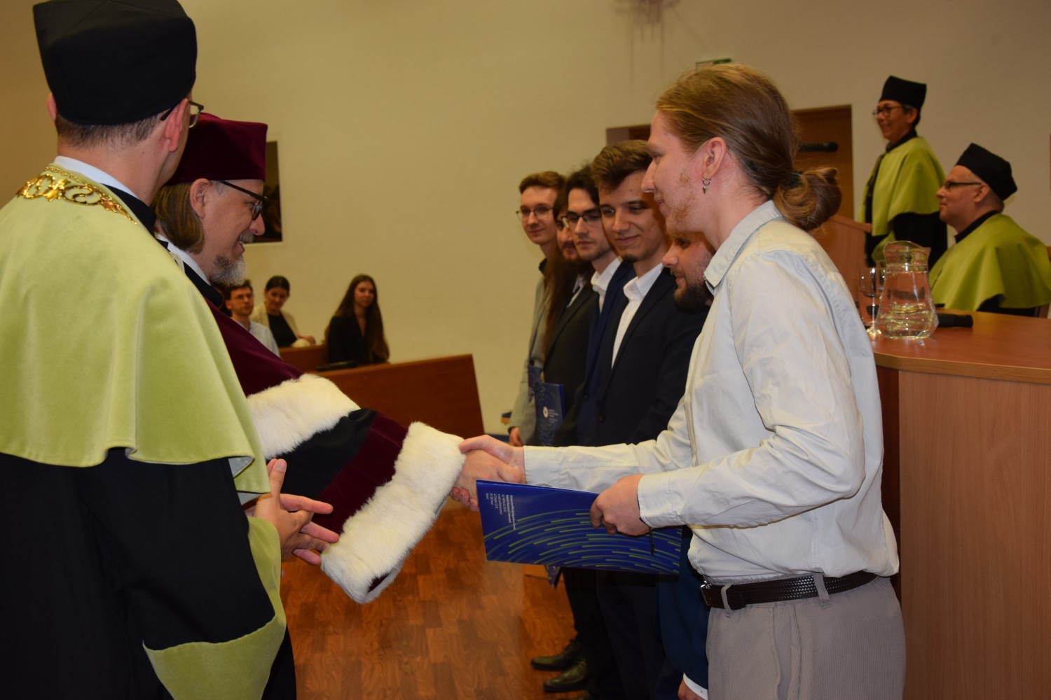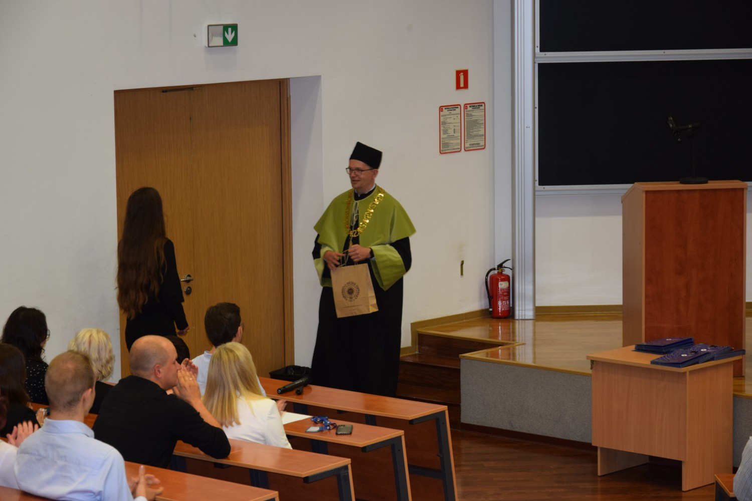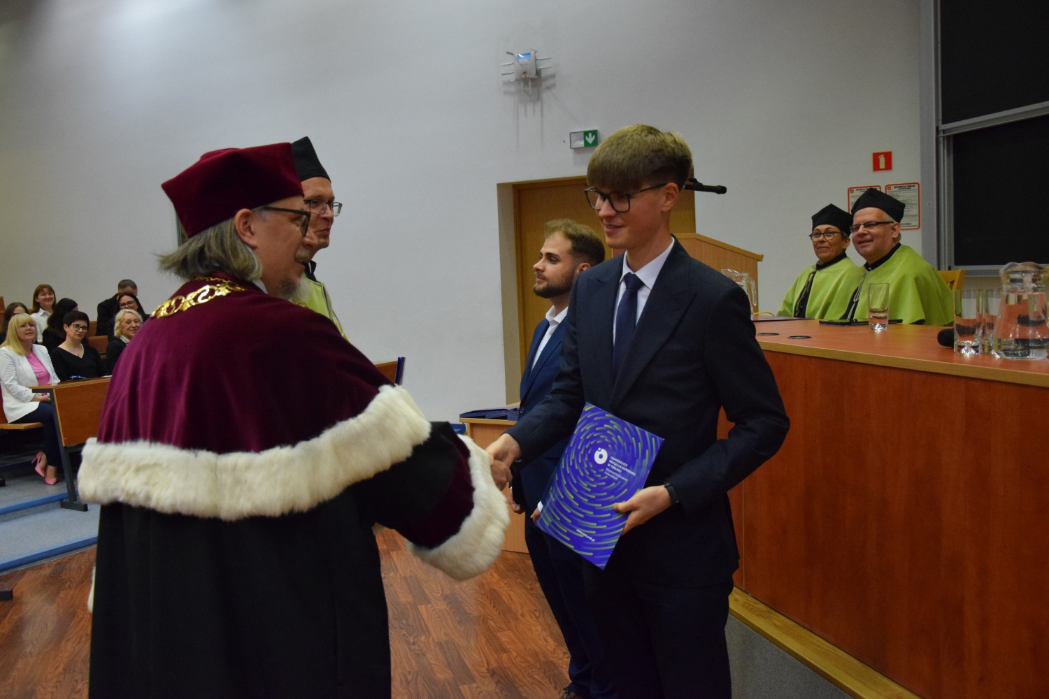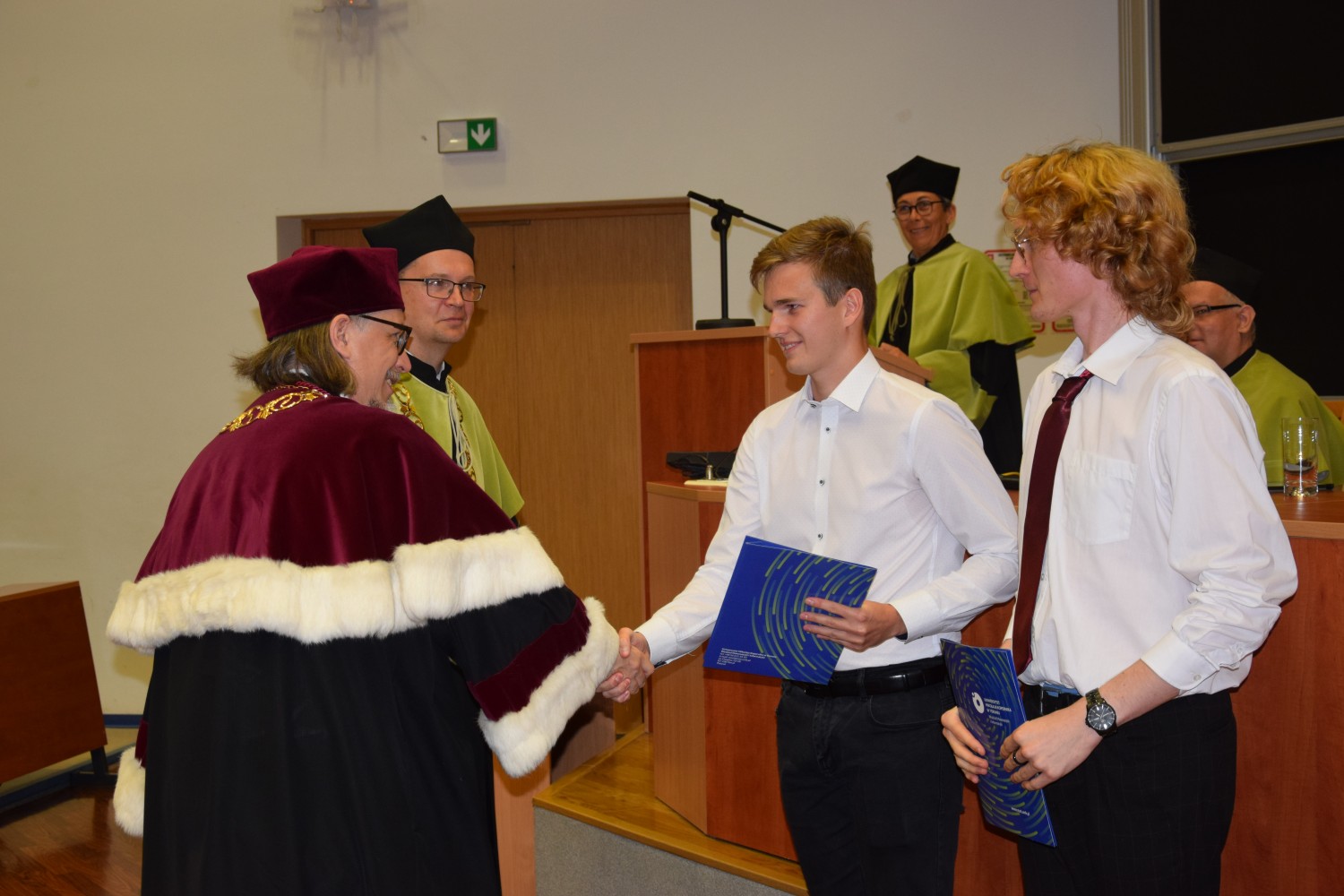 Na uroczystym rozpoczęciu roku na naszym Wydziale swoje nagrody do rąk własnych mieli okazję otrzymać najlepszy absolwent mgr Maciej Dudek oraz drugi raz z rzędu najlepszy student Mateusz Sobkowiak .