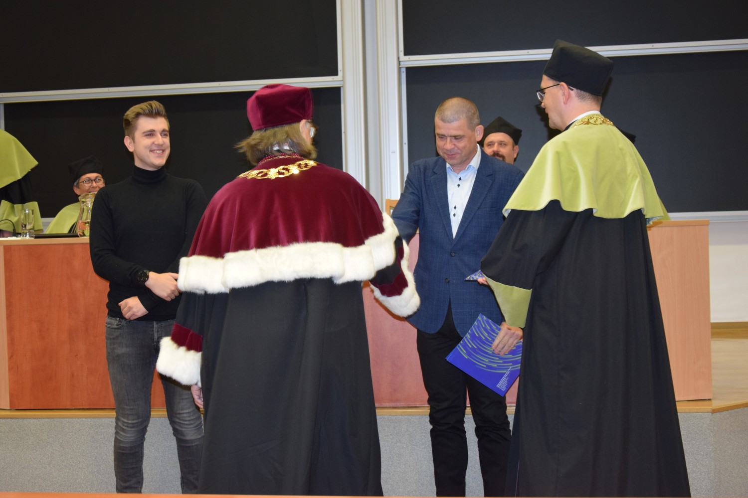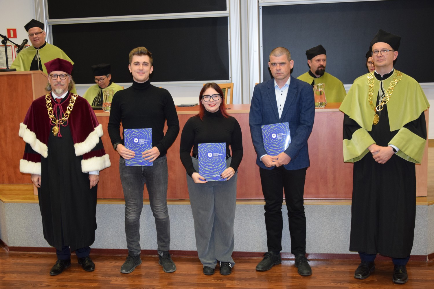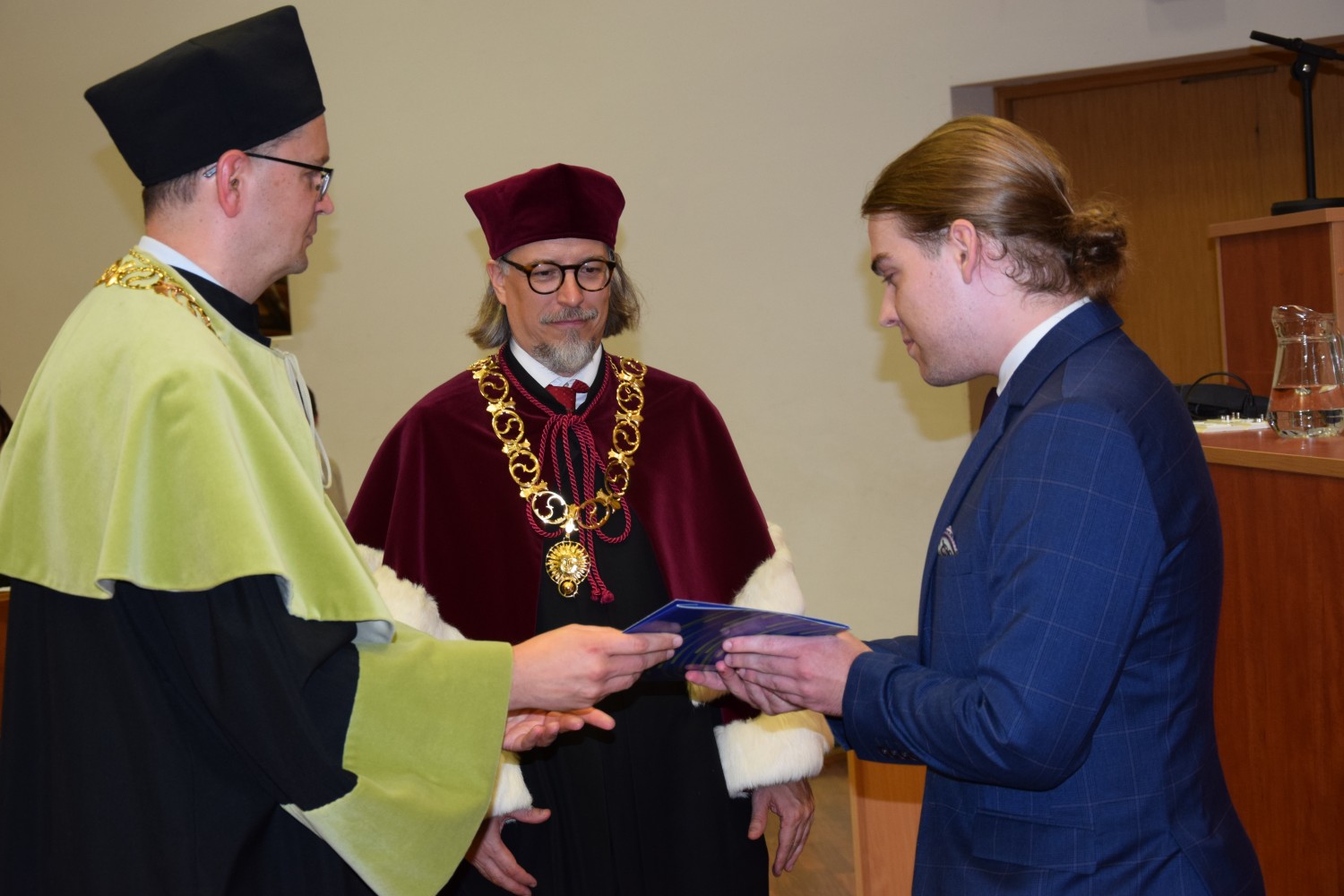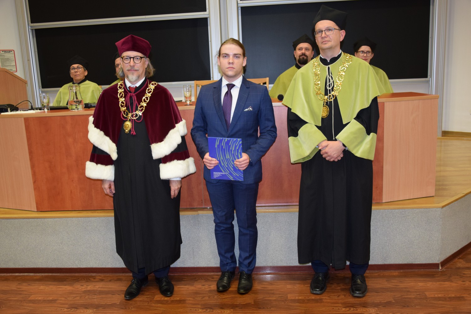 Na uroczystym rozpoczęciu roku na naszym Wydziale swoje nagrody do rąk własnych mieli okazję otrzymać najlepszy absolwent mgr Maciej Dudek oraz drugi raz z rzędu najlepszy student Mateusz Sobkowiak .