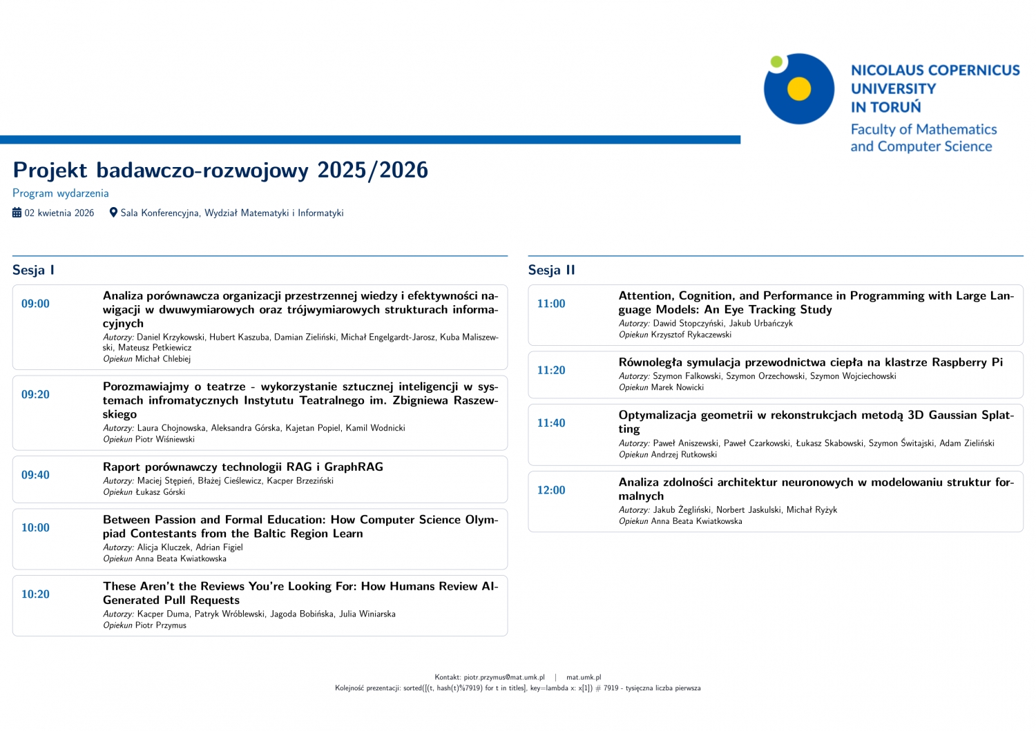 Prezentacje odbędą się w czwartek (02.04.2026) w godzinach 9:00-12:20 w sali konferencyjnej.